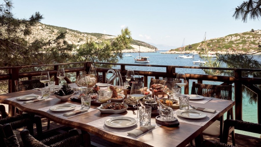 It’s impossible not to be captivated as you wind down the private lane towards the restaurant and the sea. Towering pine trees, colourful flowers, a stunning cove with crystal-clear turquoise waters, and a uniquely textured beach form a truly breathtaking setting. There, the Nobelos family has created a wonderful… relais & châteaux with just four rooms and a genuinely delightful restaurant. The atmosphere is centred around relaxation and carefree enjoyment. Everything appears "casual" yet is meticulously curated, blending rare tastefulness with high aesthetics. This unique combination has the charm to immediately relax you within moments of arriving.