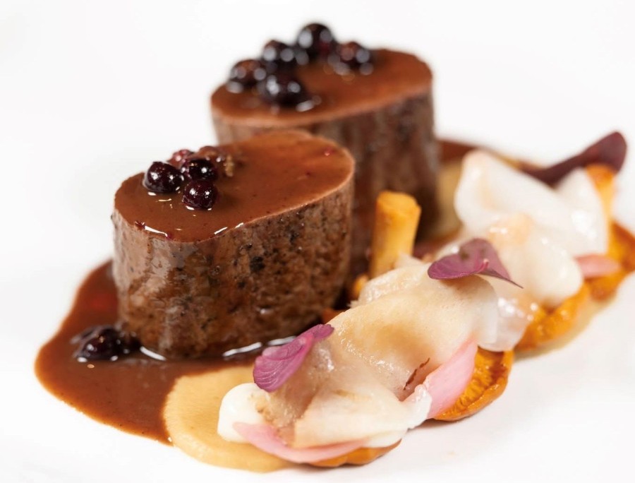 Moving on to the menu’s heavy hitters, the pigeon and the venison are two dishes of considerable power. The pigeon is cooked with exemplary precision, achieving a rare balance between depth of flavour and refinement. It retains its texture and character without losing elegance. Crisp lettuce brings a cooling freshness, umeboshi adds a finely calibrated acidity, ginger provides lift, and the sauce is delicately worked, precise and beautifully restrained. The venison, served with parsnip purée, girolle mushrooms and an impeccably judged redcurrant sauce, is equally impressive. Perfectly cooked, focused and clean in expression, it demonstrates the kitchen’s command of game and its ability to deliver intensity without heaviness.