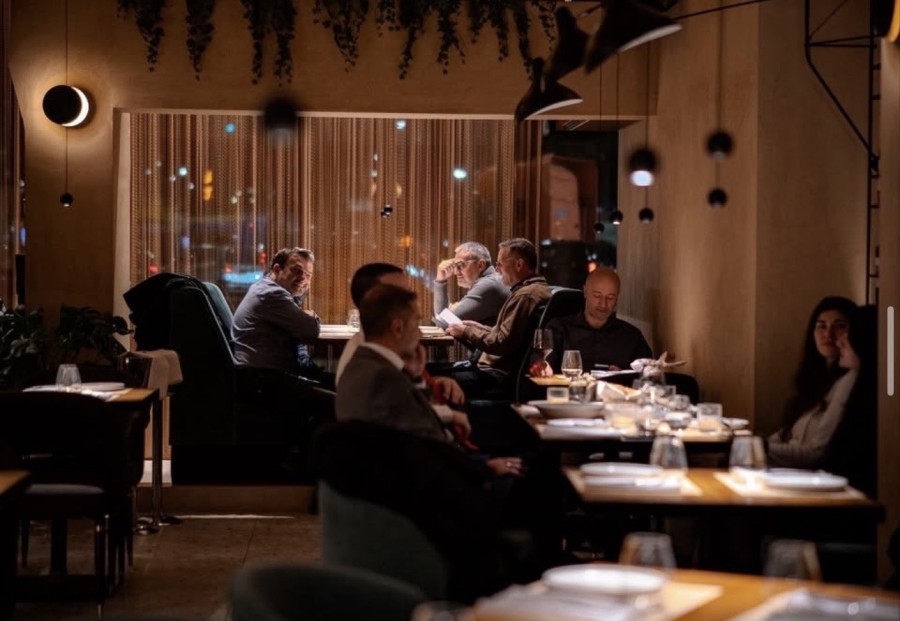 The photos of Yaboo don’t tell the whole story. Up close, the space has a warmth that can’t quite be captured in a frame — that mix of light, colour, and movement that makes everything feel alive. Its lines are clean, the design balanced, with materials that convey calm and familiarity. The walls, coated in a light-toned plaster, create a sense of continuity, while the low, warm strips of lighting soften the edges and weave the shadows in a carefully measured way. Velvety seats in shades of green and grey break the monotony, giving the room rhythm and visual harmony. The brass bar serves as a focal point — its surface almost liquid, reflecting the light and drawing the eye across the space. The layout feels deliberate, almost like a small city, with distinct “neighbourhoods” of tables, low seating, and visual lines leading towards the mezzanine, adding height and movement. It’s beautifully designed — and that table by the window, where the port glimmers through the iron mesh curtain, is a dream to sit at. There are outdoor tables too, though they’re somewhat less charming.