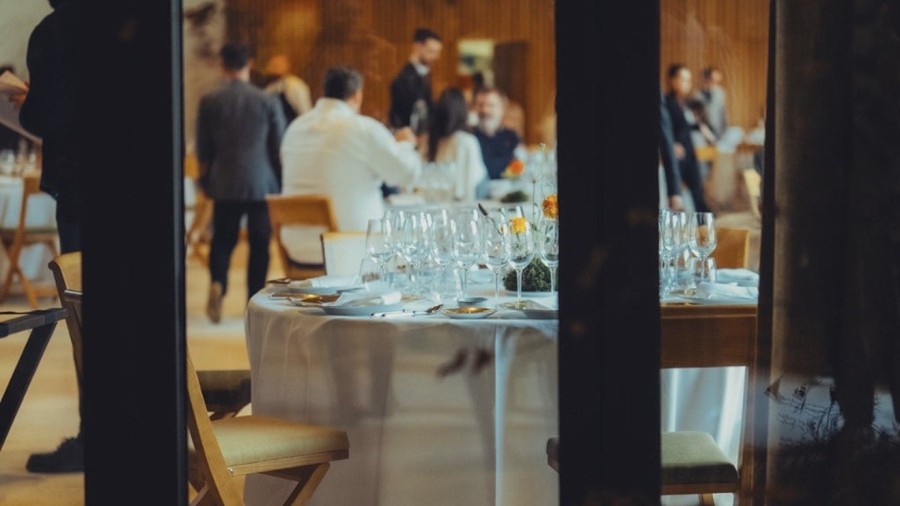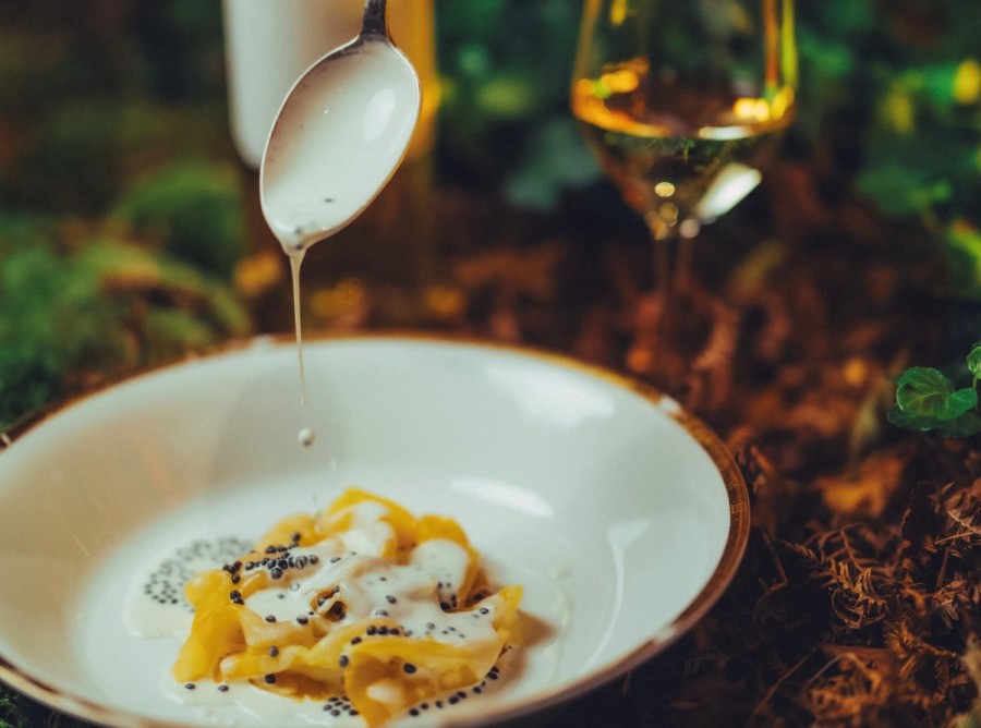 The first act unfolded where Yquem is still being written: in the cellars, among the barrels, where the new vintage slowly builds its body and complexity. It was there, in that hushed, elemental setting, that Château d’Yquem 2022 revealed itself. A wine of remarkable density and creaminess, marked by pear, citrus and apricot, layered with floral and honeyed nuances, and finishing with that saline, gently bitter note that makes it all the more compelling. Alongside it came three exquisite opening bites by Mauro Colagreco, small in scale yet masterful in execution, setting the tone for what was to follow.